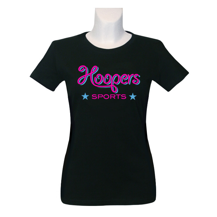 T-Shirt für Damen in schwarz mit geschwungenem Hoopers Sports Schriftzug in pink/blau.