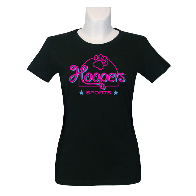 T-Shirt für Damen in schwarz mit pink/blauem Hoopers Sports Schriftzug, einem Hoopers-Hoop und einer Tatze in pink.