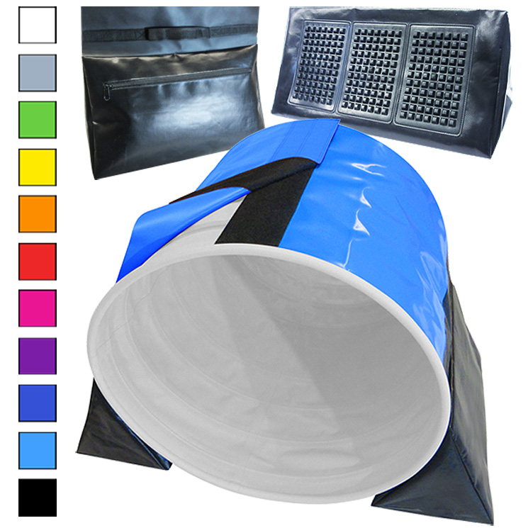 Die Dreiecke sind aus robuster schwarzer Folie. Sie haben einen Reißverschluss zur einfachen Befüllung, einen Tragegriff sowie einen verstärkten Grip Boden. Die an den Dreiecken anschließende Folie besteht aus unserem hochwertigen Tunnel-Material und ist aus allen Farben (FARBEN + transparent wählbar.