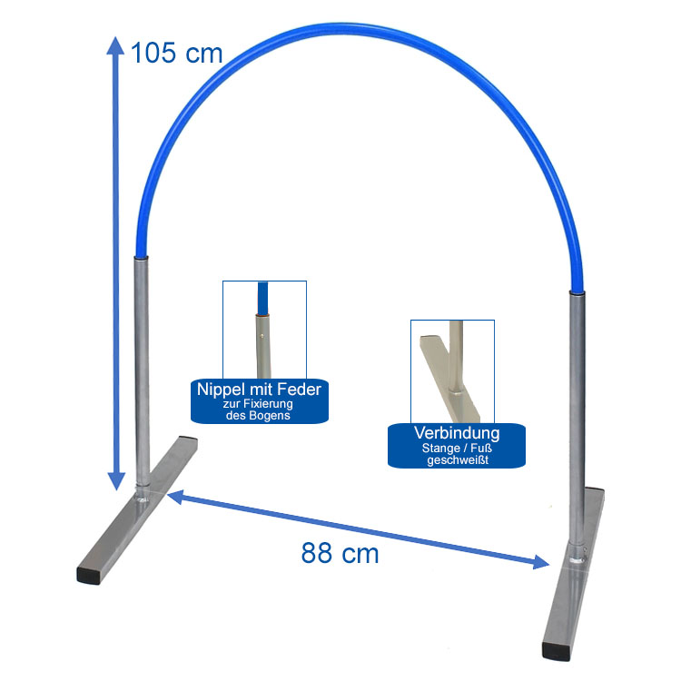 • The Hoopers Hoop is designed to be easy to transport and quick to set up, making it ideal for home training or use in competitions. The choice of five bright colors for the bow - blue, yellow, orange or white - not only makes training more visually appealing, but also allows courses to be designed individually and varied.